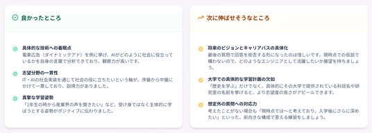 【良かったところ・次に伸ばせそうなところ】 AIが面接内容を詳細に分析し、「良かったところ」「次に伸ばせそうなところ」を具体的にフィードバックします。どの発言が高評価だったのか、どこを改善すれば更に良くなるのかが明確になり、次の練習に活かせます。