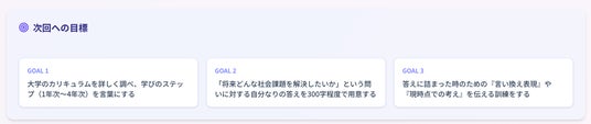 【次回への目標】 面接の内容をもとに、面接練習に限らない具体的なアクションプランを3つ、AIが提案します。教員の指導と合わせることで、面接対策の精度を高めていくことが可能です。