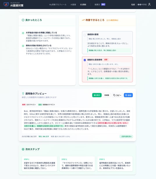 志望動機の文面を添削。助言を受けた指摘を採用するかどうかを選択可能になっており、志願者のもとの文章を尊重しながらも読みやすさや文法的表現でのアドバイスを行います。また、志望動機の内容に基づいたアクションプランも提案します。