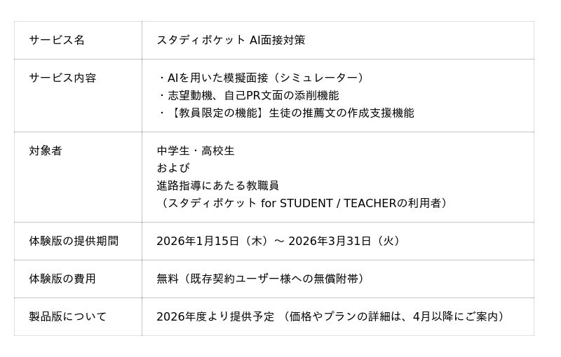 スタディポケット株式会社(本社:東京都千代田区、代表取締役:山地瞭/鶴田浩之、以下「スタディポケット」)は、学校向け生成AIサービス「スタディポケット for STUDENT」において、AIと音声・ビデオで対話しながら模擬面接ができる新機能「スタディポケット AI面接対策」の体験版を、本日2026年1月15日より順次、提供開始いたします。また、合わせて特設サイト ( https://career.studypocket.ai ) を公開いたしました。