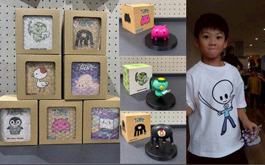 スケッチブックにお絵かきをしたら、スマートフォンで写真を撮って、専用マシーンにアップロードするだけ。1分後には、スケッチブックから飛び出したオリジナルキャラクターが誕生。そのキャラクターが世界に一つだけのオリジナルグッズになります。