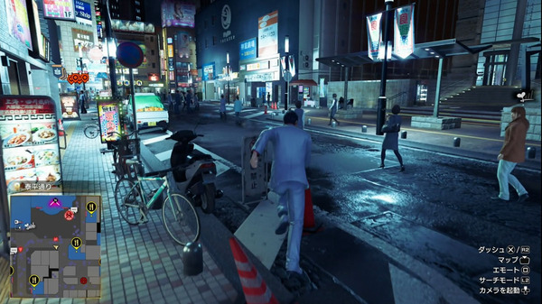 神室町の風景。新宿の歌舞伎町がモデルになっている。ちなみに、頭に赤い印のある人たちはチンピラなどの襲ってくる人たち。逃げることもできるが、倒すとお金などがもらえる