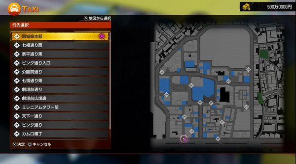 タクシーに乗れば、行き先を指定することで瞬時に目的の場所に移動できる。読み込みも短く、非常に快適! タクシーを探さなくても、全体マップでタクシー降り場を選べば、ファストトラベルができる