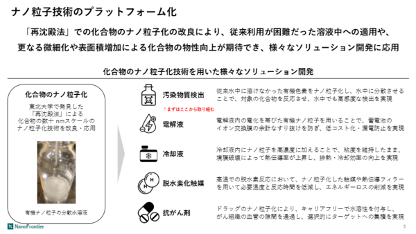 NanoFrontierの中核技術は、東北大学で長年研究されてきた「再沈殿法」を改良した、化合物のナノ粒子化技術だ。