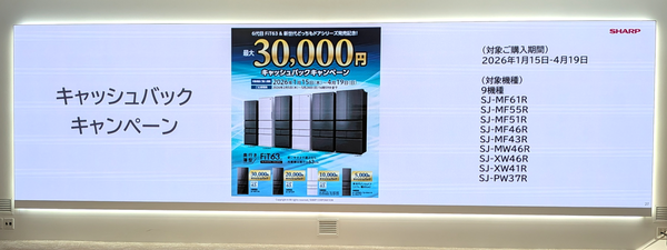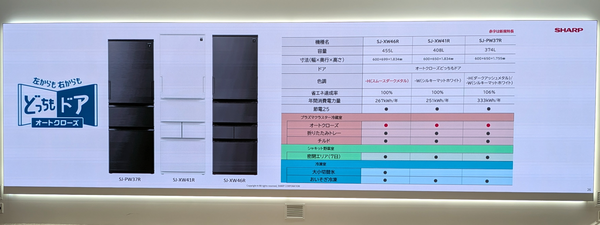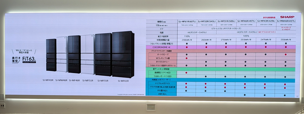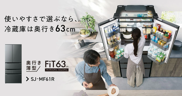 ラインアップは、「FiT63シリーズ」としてフレンチドアタイプの「SJ-MF61R」(607L)、「SJ-MF55R」(545L)、「SJ-MF51R」(505L)、「SJ-MF46R」(457L)、「SJ-MF43R」(429L)と、どっちもドアタイプの「SJ-MW46R」(457L)の計6機種。さらに、「オートクローズどっちもドア」を搭載した「SJ-XW46R」(455L)、「SJ-XW41R」(408L)、「SJ-PW37R」(374L)の3機種も展開する。発売を記念して、最大3万円のキャッシュバックキャンペーンも実施される予定だ。
