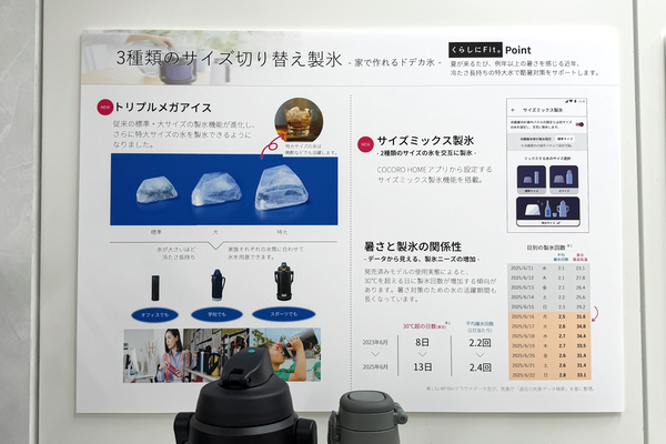近年の「猛暑」対策として、製氷機能「トリプルメガアイス」も見逃せない。データによれば、猛暑日の増加に伴い、家庭での製氷回数は増加傾向にあるという。これに応えるため、従来の標準・大サイズに加え、新たに「特大」サイズの製氷が可能になった。溶けにくい大きな氷はマイボトルや水筒での持ち運びに最適だ。さらに、アプリ設定で「サイズミックス製氷」を使えば、製氷皿に注水する水量を調整することで口径の広い子供用の水筒に適した特大サイズと大人用水筒の口径に合わせたの標準サイズの氷を交互に作るといった運用も可能になる。