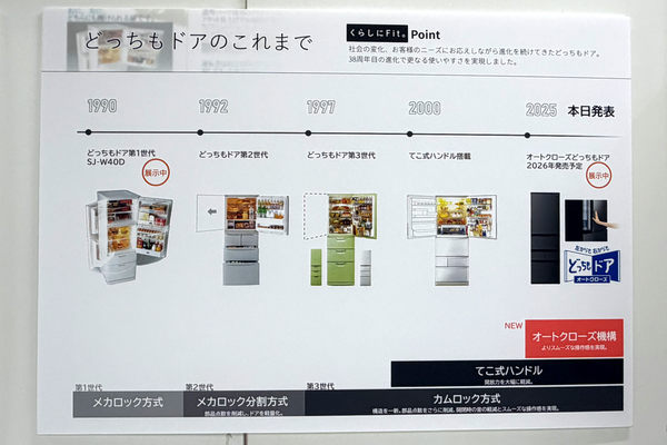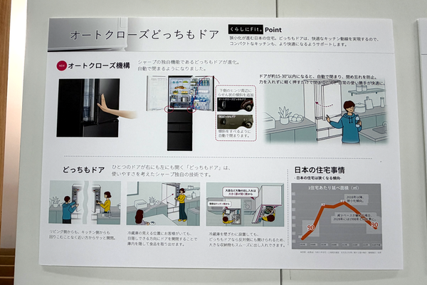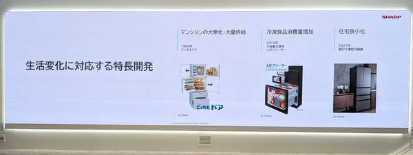 シャープの冷蔵庫開発の歴史は、常に日本の住環境や生活様式の変化と共にあったといえる。発表会で紹介された開発エピソードによれば、1988年にはマンションの大衆化に伴うキッチンのレイアウト変化に対応するため、左右どちらからでも開ける「どっちもドア」を開発。2014年には共働き世帯の増加による冷凍食品の消費拡大を受け、大容量冷凍室を備えた「メガフリーザー」を世に送り出した。そして2021年、都市部を中心とした住宅の狭小化に対応すべく、薄型設計の冷蔵庫を投入している。