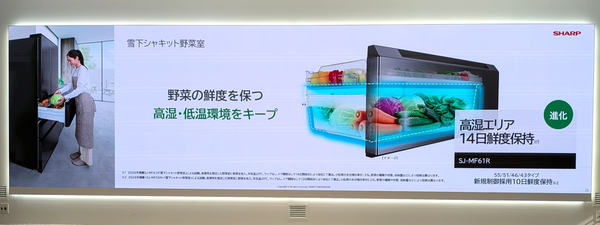 ハードウェア面でのトピックは、シリーズ名「FiT63」の由来でもある奥行き63cmの薄型設計だ。これは、1993年から2023年にかけて住宅面積が増加していないという「住宅事情」へのアプローチである。システムキッチンと面を合わせやすく、すっきり設置できるサイズ感でありながら、最上位機の「SJ-MF61R」では定格内容積607Lの大容量を確保した。この薄型サイズでの600Lクラス投入は、同社として12年ぶりとなる。都市部の限られたキッチンスペースでも、まとめ買い需要に応える大容量を実現した待望のモデルと言える。