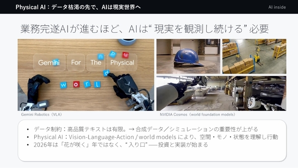 そして、タスク単位から業務単位でのAI導入が進むと、企業の「実データ」の優位性もより高まり、RAGを始めとするデータ連携のための技術の重要度も増してくる。加えて、長時間の業務を任せられるようになると、現場を観測し続ける需要も高まり、リアルデータを用いる「フィジカルAI」への投資と実装が始まる年になるという。