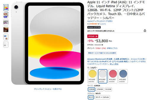 今回セール対象の「11インチ iPad」は、A16チップ/128GB/Wi-Fi 6の組み合わせ。タイムセールで9%オフの53,800円で販売中です。
