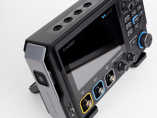 電源ボタンは、本体左側面。前面下部には、テスト信号(1KHzパルス)端子、Ch1入力、Ch2入力、信号発生器出力が並んでおり、オシロスコープ用の端子はここで完結するようになっています。もう1つの機能であるマルチメーター用の端子は、本体上面と明確に分けられていました。