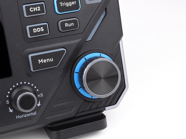 右下にあるダイヤルでは、トリガーレベルと波形の横軸位置の移動が可能です。ダイヤルを押すと、移動する対象を切り替えられます。とくにトリガーレベルは手動で変更することも多いですから、ダイヤルで操作できるというのは便利です。