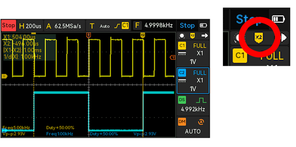 このカーソルが便利なのは、2つのカーソルで挟んだ範囲を計測してくれること。X1とX2間の時間がどのくらいかひと目でわかります。