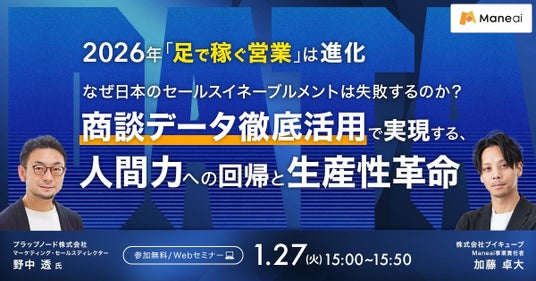 株式会社ブイキューブ(本社:東京都港区、代表取締役社長 グループCEO:間下 直晃、以下 ブイキューブ)は、2027年に予定される労働基準法改正を見据え、営業組織の生産性向上とセールスイネーブルメントの本質を問う無料オンラインセミナー「【2026年『足で稼ぐ営業』は進化】なぜ日本のセールスイネーブルメントは失敗するのか? 『商談データ徹底活用』で実現する、人間力への回帰と生産性革命~案件126%増:プラップノード社が証明。「現在地」のデータ化こそが、組織進化のスタート地点~」を、2026年1月27日(火)に開催することをお知らせいたします。