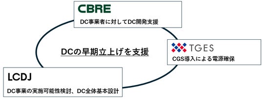 本協定は、データセンター用地に関する豊富な知見とネットワークを有するCBRE、開発コンサルタントとして事業計画段階からの検討を支援するLCDJと、国内外で豊富なCGS導入実績を有するTGESが連携し、DC計画の初期段階から本ソリューションの導入検討することを通じて、DCの早期立ち上げに貢献するものです。