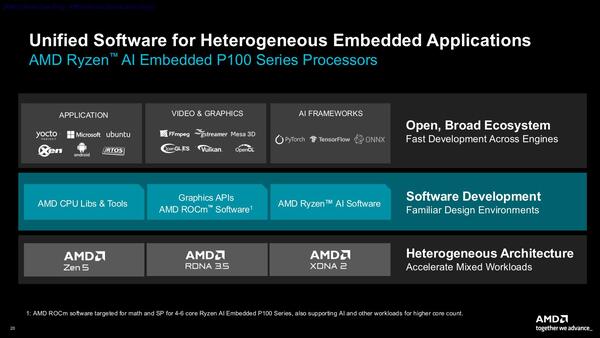 少し気になるのがS/Wのサポート。先程ROCmに言及したが、Ryzen AI Embedded P100ではROCm Softwareがちゃんとサポートされる。なのだが脚注を見ると、「4~6コアのP100シリーズでは、算術演算とSP(Special Function:特殊演算)のみサポートされ、AIその他のワークロードはより高いコア数のCPUでサポートされる」となっている。