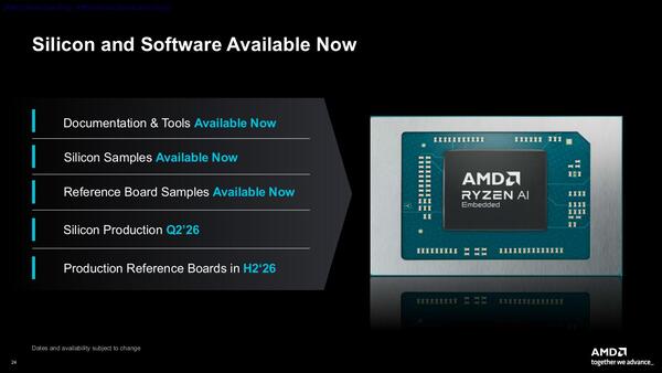 そのRyzen AI Embedded P100はすでにドキュメント/開発ツールとサンプル、開発ボードのサンプルは入手可能になっており、製品量産は今年第2四半期、量産向けのリファレンスボード(必要なら最終製品に組み込める品質のボード)の出荷は今年後半とされている。