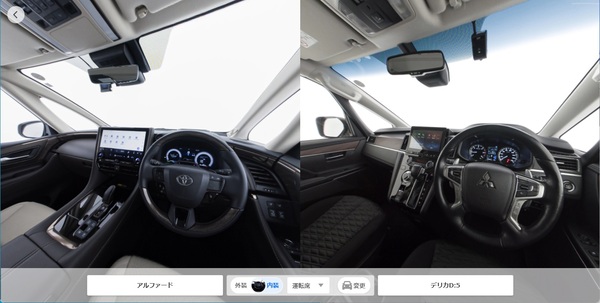 「360°ショールーム」の最大の特徴は、専用スタジオで実写撮影された高解像度画像を使用している点だ。CGではなく実車を用いているため、シートのステッチや素材の質感といった細部まで確認できる。ユーザーは任意の2台を選択し、画面上で並べて比較可能で、同じ角度、同じ拡大比率で同期して動かせるため、車種によるサイズ感の違いや、内装の広さなどを直感的に把握できる。