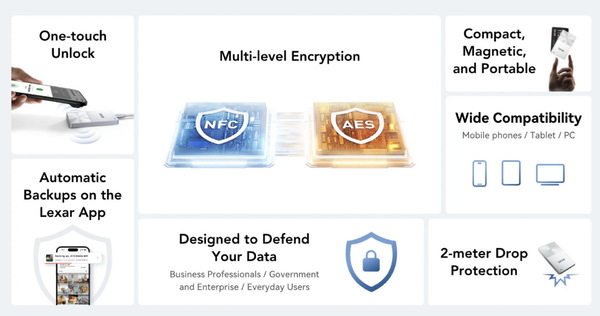 NFC対応のデュアル暗号化ポータブルSSD。NFC認証と128ビットAESハードウェア暗号化を備え、スマートフォンを鍵としてタップするだけでセキュアなデータにアクセス可能。薄型マグネット式ドライブで、写真の自動バックアップにも対応する。