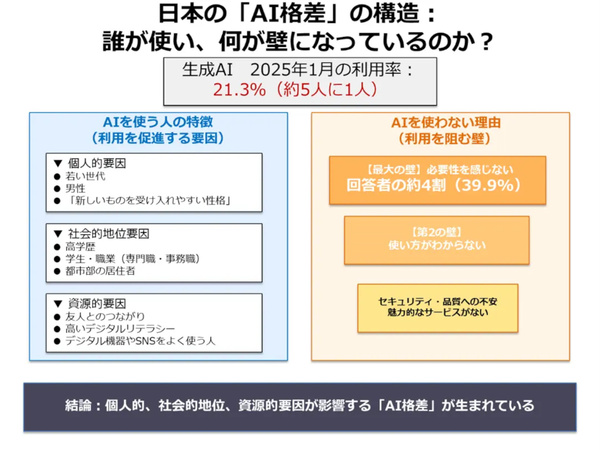 全国のインターネット利用者1.3万人を対象に実施した、生成AIの利用実態調査より。生成AIを利用する人は、回答者全体のおよそ5人に1人(21.3%)。「年齢」や「デジタルリテラシー」だけでなく、「性別」「性格」「学歴」「職種」「居住地域」「人とのつながり」といった要因によっても、利用する/しないの「利用格差」が見られた。たとえば、社会的地位要因では「高学歴」(大卒者で約1.4倍、院修了者では約1.7倍)、学生(約1.9倍)や専門職(約1.6倍)、都市部居住者(約1.3倍)で生成AIの利用率が高かったという。