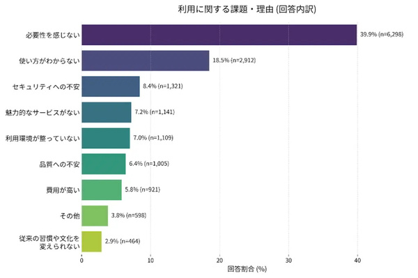 ・利用率が高いのは「若い世代」「男性」「新しいものを受け入れやすい性格」「高学歴」など ・利用しない理由「必要性感じない」(39.9%)「使い方不明」(18.5%)など