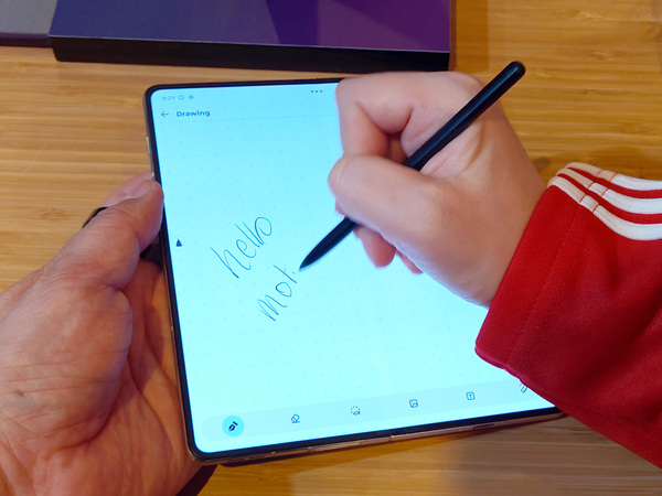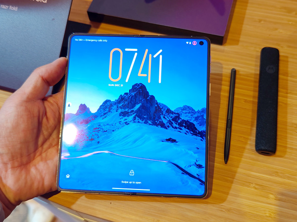 1枚目の写真の右に写っているスタイラス「moto pen ultra」による手書き入力にも対応。ペンサイズはサムスンの「S Pen」に類似した細いタイプだが、円筒形のケースに入れた上で充電して使用する。また、メインディスプレーだけではなく、開いたときのカバーディスプレーでも手書きが可能だ。