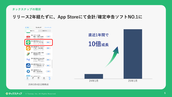 また、税理士監修の「税務調査リスクチェック」機能で、入力内容や仕訳データをもとに、同じ職種の傾向と比較しながら税務調査リスクを判定。万が一、税務調査で追徴された場合は、利用料を全額返金する保証(適用条件あり)を備える。提出前の不安を取り除き、安心して確定申告ができるようサポートする機能を搭載しているとのこと。直近1年間では、登録会員数が10倍に成長しているという。