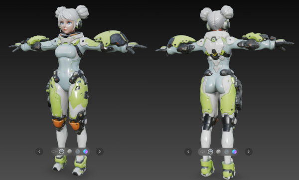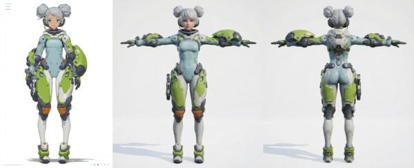 そこで、Nano Banana Proを使って、3Dグラフィックス風の見た目にします。手と身体がモデルとしてくっついたりしないように、3Dモデルの一般的なポーズの「Tポーズ」姿勢になるように指定します。そうすることで、より生成しやすいデザインになります。最低限、前と後ろの二面図があれば、3Dにすることができます。