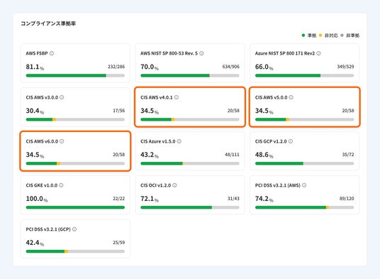 他のコンプライアンスと同様に、ダッシュボード画面およびコンプライアンス画面にて、各コンプライアンスへの準拠状況を確認できます。