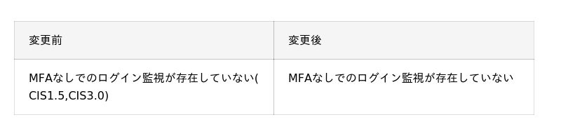 しかし、v1.5以降のバージョンでは同一のチェック内容が求められているため、表記を簡潔にする目的で、「MFAなしでのログイン監視が存在していない(CIS1.5, CIS3.0)」を「MFAなしでのログイン監視が存在していない」へ変更いたします。