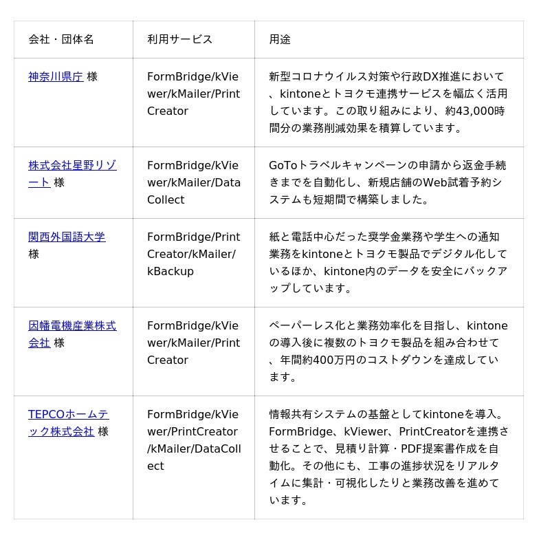・kViewer(ケイビューワー): kintoneのライセンスを持っている人しか閲覧できないkintone内の情報を、外部の方も見られるようになります。外部公開用のページ作成や情報の移し替えをする必要がなくなり、業務効率がアップします。