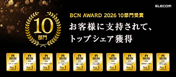 エレコムは1月19日、BCN主催の「BCN AWARD 2026」において、全10部門で最優秀ベンダーを受賞したことを発表した。受賞した部門は、『キーボード』、『マウス』、『モバイルバッテリ・充電器』、『スマートフォンケース』、『スマートフォン保護シート』、『タブレット端末アクセサリ』、『サウンド関連ボード』、『携帯オーディオアクセサリ』、『10キーボード』、『映像関連ボード』である。