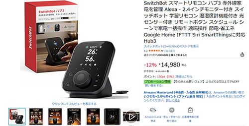 SwitchBot(スイッチボット)のスマートリモコン「ハブ3(Hub3)」が、Amazonで割引対象です。参考価格16,980円から12%オフの14,980円で購入できます。