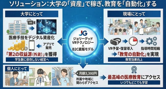 また、これに合わせ、大学が保有する高度な医療技術をVRコンテンツ化し、本プラットフォーム上で「有料コース」として個人へ直販できる新たなパートナーシップ制度「JGリスキリング事業立上げパッケージ」の提供も開始します。