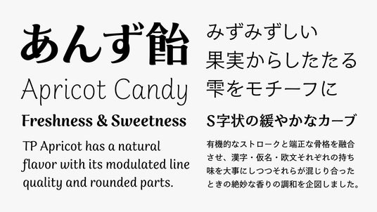 タイププロジェクトの代表取締役 鈴木 功は、「TP アプリコットは、手書きのあたたかみと高い可読性を兼ね備えた書体ファミリーです。ローコントラスト(甘味)にミドルコントラスト(甘酸っぱさ)とハイコントラスト(酸味)が加わったことで、アプリコットの甘い香りと爽やかな酸味のバランスを制御して視覚に訴えることができるユニークなファミリーになりました。3つのコントラストと5つのウエイトがすべて出揃い、書籍タイトルや食品パッケージなどで高い効果を期待できる書体ファミリーとしてお届けできることを大変うれしく思います。」と述べています。