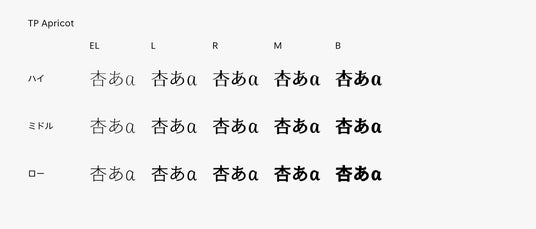 TP アプリコット ハイコントラストおよびミドルコントラストは、すでに提供中のローコントラストと同様、EL(エクストラライト)、L(ライト)、R(レギュラー)、M(ミディアム)、B(ボールド)の5 ウエイトで提供します。