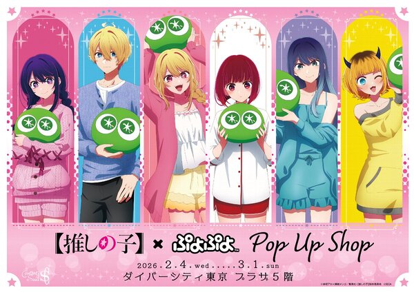 ダイバーシティ東京 プラザにて、「【推しの子】×ぷよぷよ」POP UP SHOPを開催。描きおろしイラストを使用したグッズ販売のほか、館内に設置されたスタンプを集めると特典ステッカーがもらえるスタンプラリーや、特大アクリルフィギュアが当たる抽選会などを開催する。