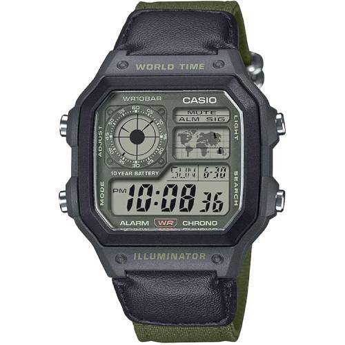 カシオコレクションの「AE-1200」シリーズのモデルで、LCアナログと世界地図表示を同時に載せた画面構成が特徴。正直かなり情報過多です。でも、なぜかクセになる感じ。