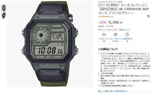 CASIO(カシオ)の多機能デジタルウオッチ「AE-1200WHUB-3AJF(ブラック/グリーン)」が、Amazonで割引対象になっています。参考価格7,000円のところ、23%オフの5,390円です。