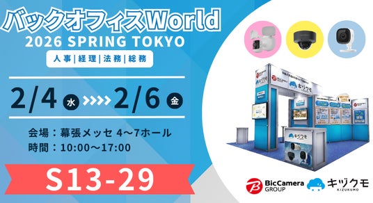 ブースでは、工事不要で導入できる法人向けクラウドカメラサービス「キヅクモ」の実機を展示し、オフィスや支店などの多拠点管理業務を効率化する「かんたんDX」体験を提供します。
