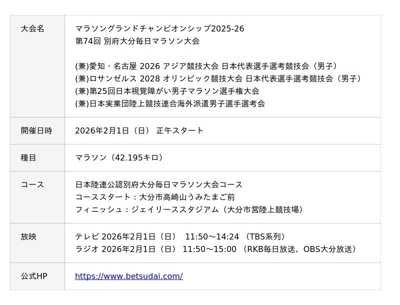 「別府大分毎日マラソン大会」は、1952年に始まり国内で最古の民放テレビ中継を実現した大会です。伝統の大会の歴史はまさに、世界へ羽ばたくランナーの足跡と重なります。今大会は、ロサンゼルス 2028 オリンピック競技大会の代表選考会となり、白熱したレースが予想されます。