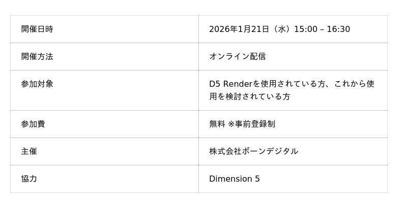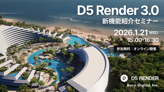株式会社ボーンデジタル(本社:東京都千代田区、CEO:新 和也、URL:https://www.borndigital.co.jp/ )は、リアルタイムレンダラー「D5 Render」の最新アップデートを紹介するオンラインセミナー「D5 Render 3.0 新機能紹介セミナー」を、2026年1月21日(水)に開催いたします。