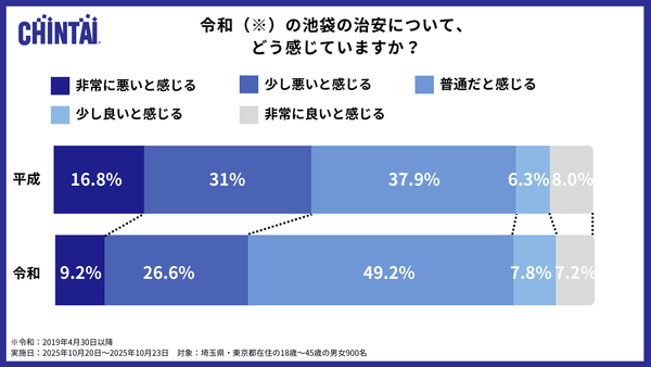 調査結果によると、平成期に「池袋の治安は悪い」と感じていた割合は47.8%と約半数にのぼっていた一方で、令和の評価では「非常に悪い」「少し悪い」と回答した割合が合計35.8%にまで減少し、「普通」「良い」と評価する層が約6割を占める結果となっている。