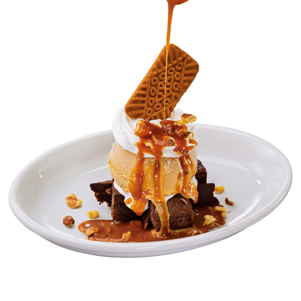 温かいブラウニーと冷たいキャラメルアイスの絶妙なマリアージュが堪能できる。別添えで提供される温かくほろ苦いキャラメルソースをかけて、より濃厚な味わいを楽しむこともできる。