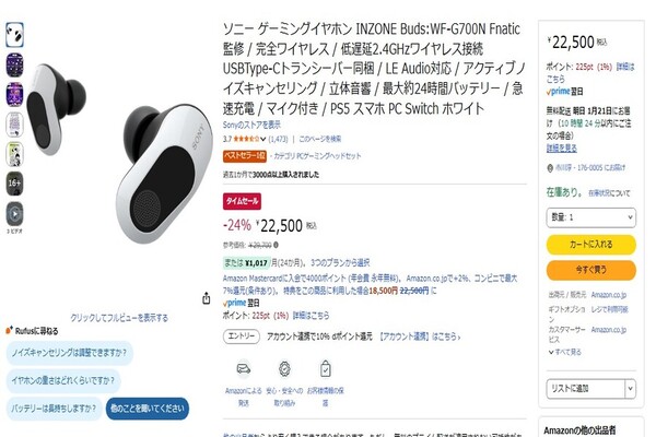 Amazon.co.jpにて、ソニーのゲーミングイヤフォン「INZONE Buds WF-G700N(B0CKFHB9P3)」が販売中だ。参考価格は2万9700円だが、執筆時点での価格は24%オフの2万2500円(1月20日時点)。