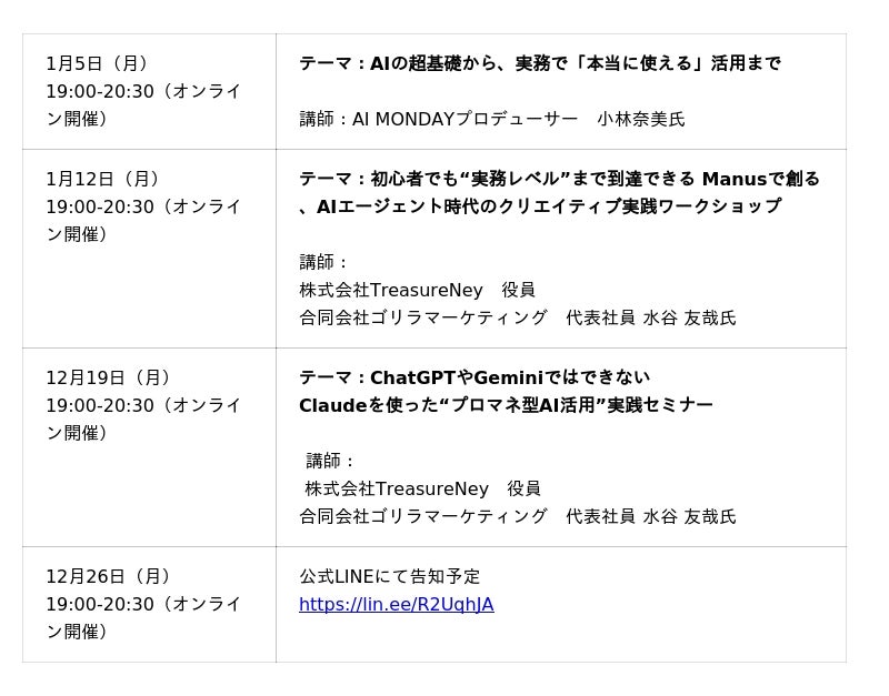 【毎週月曜はAIで世界が広がる日】生成AIを実践的に学べる「AI MONDAY」2026年1月の開催スケジュールを公開
