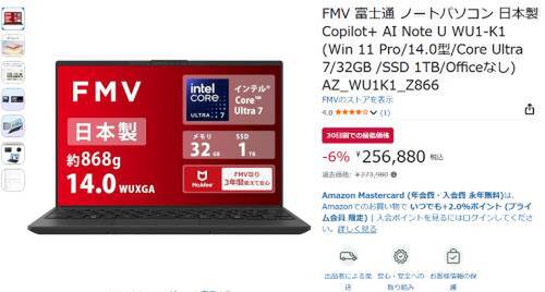 富士通FMVの14型モバイルノートPC「Note U WU1-K1(AZ_WU1K1_Z866)」が、Amazonで割引対象になっています。過去価格273,980円のところ、現在は6%オフの256,880円で販売されています。