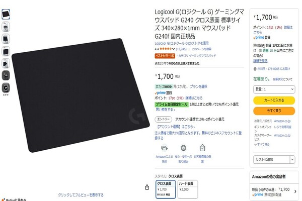 Amazon.co.jpにて、ロジクールGのゲーミングマウスパッド「G240f」が販売中だ。価格は1700円。