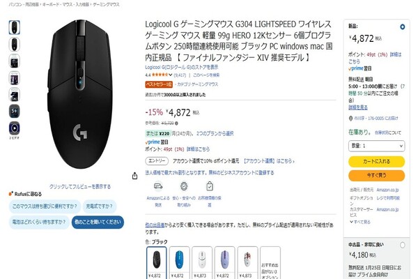 Amazon.co.jpにて、ロジクールGのワイヤレスゲーミングマウス「G304」が販売中だ。参考価格は5720円だが、執筆時点では15%オフの4872円(1月20日時点)。