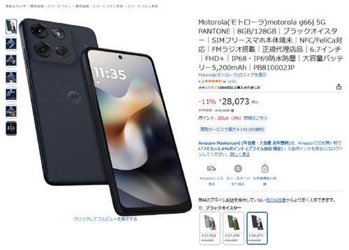 Motorola(モトローラ)のSIMフリースマートフォン 「motorola g66j 5G」が、Amazonで割引対象になっています。参考価格31,636円から、現在は11%オフの28,073円で販売中です。